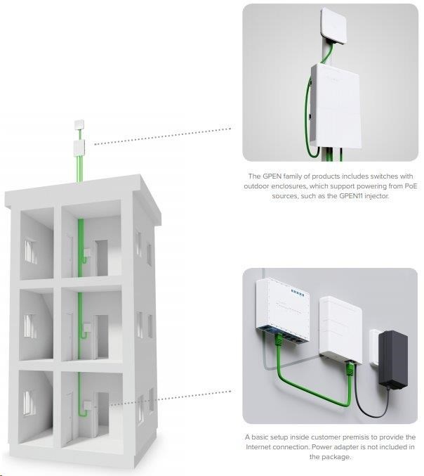 gPEN11 je nástenný injektor POE s dvoma gigabitovými ethernetovými portami, ktorý môžete použiť na napájanie zariadení určených na príjem alebo distribúciu pripojenia na mieste inštalácie. Výstupné napätie je rovnaké ako vstupné napätie a pohybuje sa v rozmedzí 12-57 V.