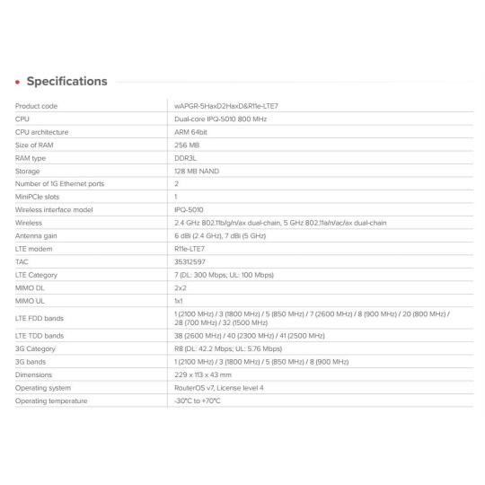 Sada wAP ax LTE7 přináší rychlé a spolehlivé Wi-Fi 6 do vaší venkovské chaty nebo jakéhokoli jiného náročného prostředí – například venkovské čerpací stanice nebo autobusové zastávky. Odolný design wAP díky své jednoduchosti a odolnosti zůstává oblíbeným produktem mezi uživateli MikroTik. Aktualizovaný kryt ještě více zvyšuje odolnost a pro větší bezpečnost je vybaven skrytým antivandalským šroubem za logem MikroTik. Nyní přichází vylepšen o modem CAT7 LTE s dvojnásobnou rychlostí nahrávání a výkonnější platformu ARM. Výkonné dvoupásmové rádio s duálním řetězcem (2x2 MIMO) zajišťuje silné bezdrátové pokrytí v celém vašem domě, na zahradě nebo v obchodních prostorách. Integrované antény s vyšším ziskem a přepracovaným systémem LTE pro ještě lepší kvalitu signálu, vyšší dosah a lepší stabilitu v náročných prostředích. Proč upgradovat na CAT7? • Dvojnásobná rychlost nahrávání (v závislosti na infrastruktuře LTE vysílačů a dalších proměnných) • Rozšířená podpora frekvencí, včetně pásma 28 (700 MHz) a pásma 32 (1500 MHz) pro lepší výkon v exponovaných oblastech • Agregace nosných (2×CA) pro vyšší účinnost a odezvu v rušných sítích • Stejný osvědčený design – žádné změny v instalaci nebo konfiguraci • Nižší náklady – lepší konektivita Vylepšený hardware s jednoduchou správou Tento kompaktní přístupový bod je vybaven moderním dvoujádrovým procesorem ARM a běží na systému RouterOS v7, což zajišťuje stabilní připojení k internetu a vynikající výkon VPN. wAP ax LTE7 kit také podporuje nový systém CAPsMAN pro snadnou centralizovanou správu více zařízení pouhými několika kliknutími. Zařízení je vybaveno dvěma gigabitovými ethernetovými porty, z nichž jeden má PoE-in pro flexibilní možnosti napájení. Lze také použít standardní DC konektor. Nenápadný design – odolný proti povětrnostním vlivům a vandalismu wAP ax LTE7 je navržena tak, aby zapadla do jakéhokoli prostředí. Její jednoduchý, elegantní design nepřitahuje nežádoucí pozornost, takže je ideální i pro rušná veřejná prostranství. wAP lze bezpečně připevnit k jakékoli vnější stěně nebo střeše zevnitř pouzdra. Vyznačené prohlubně na zadní straně krytu označují místo pro vrtání otvoru pro průchod kabelu, což umožňuje diskrétní a bezpečné montáž na stěnu. Technické specifikace: Product code: wAPGR-5HaxD2HaxD&R11e-LTE7 CPU: Dual-core IPQ-5010 800 MHz CPU architecture: ARM 64bit Size of RAM: 256 MB RAM type: DDR3L Storage 128 MB NAND Number of 1G Ethernet ports: 2 MiniPCIe slots: 1 Wireless interface model: IPQ-5010 Wireless: 2.4 GHz 802.11b/g/n/ax dual-chain, 5 GHz 802.11a/n/ac/ax dual-chain Antenna gain: 6 dBi (2.4 GHz), 7 dBi (5 GHz) LTE modem: R11e-LTE7 TAC: 35312597 LTE Category: 7 (DL: 300 Mbps; UL: 100 Mbps) MIMO DL: 2x2 MIMO UL: 1x1 LTE FDD bands: 1 (2100 MHz) / 3 (1800 MHz) / 5 (850 MHz) / 7 (2600 MHz) / 8 (900 MHz) / 20 (800 MHz) / 28 (700 MHz) / 32 (1500 MHz) LTE TDD bands: 38 (2600 MHz) / 40 (2300 MHz) / 41 (2500 MHz) 3G Category: R8 (DL: 42.2 Mbps; UL: 5.76 Mbps) 3G bands: 1 (2100 MHz) / 3 (1800 MHz) / 5 (850 MHz) / 8 (900 MHz) Dimensions: 229 x 113 x 43 mm Operating system: RouterOS v7, License level 4 Operating temperature: -30°C to +70°C Napájení: Number of DC inputs: 2 (DC-jack, PoE-In) DC-jack input Voltage: 12-57 V PoE-In input Voltage: 18-57 V Power adapter nominal voltage: 24 V Power adapter nominal current: 0.8 A PoE-in: 802.3af/at Max power consumption: 13 W.