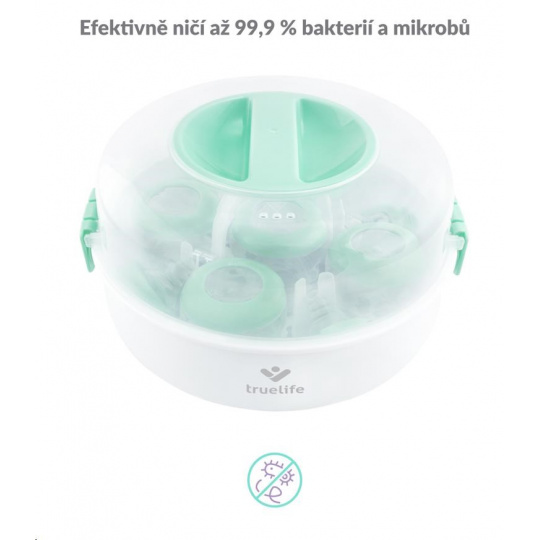 Ochrana imunitného systému vášho dieťaťa pre vás nemusí znamenať neustále vyvarenanie fľaštičiek a cumlíkov. So sterilizátorom do mikrovlnnej rúry TrueLife Invio MS5 sterilizujete detské fľaštičky, hryzátka a ďalšie predmety behom dvoch minút. Na to potrebujete len obyčajnú vodu a mikrovlnnú rúru. Sterilizátor využíva nemocničnú metódu parnej sterilizácie, ktorá je rýchla, účinná a bez chemických látok. Ničí tak 99,9 % baktérií a mikróbov, ktoré sa nachádzajú na detských predmetoch, bez poškodenia ich povrchu. Sterilizátor je navrhnutý pre väčšinu mikrovlnných rúier na trhu a zvládne väčšinu typov dojčenských fliaš. Pojme až 5 fľaštičiek naraz a ľahko sa ovláda. Vďaka kompaktnej veľkosti s ním môžete bez problémov cestovať.