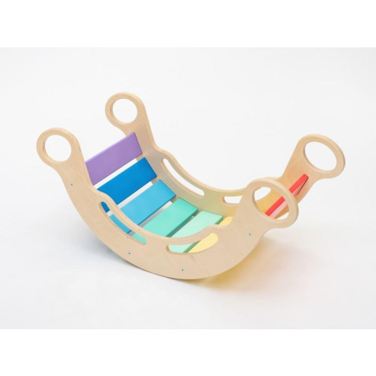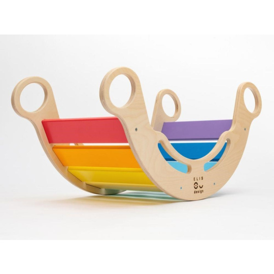 Veľmi kvalitná, bezpečná, hravá a vylepšená Montessori dúhová hojdačka 5v1 od ELIS DESIGN v úžasných sviežich, pestrých farbách, podporí správny motorický rozvoj vášho dieťaťa. Jej všestranné využitie umožní deťom používať hojdačku nielen na hojdanie, ale aj ako šmýkačku, úkryť, preliezačku alebo sedačku. Hojdačka (rainbow rocker) je vyrobená z tých najkvalitnejších materiálov, ručne dôkladne opracovaná a poctivo lakovaná farbami s atestom. Krásne farebná drevená hojdačka je vhodná pre deti od 1 do 6 rokov.