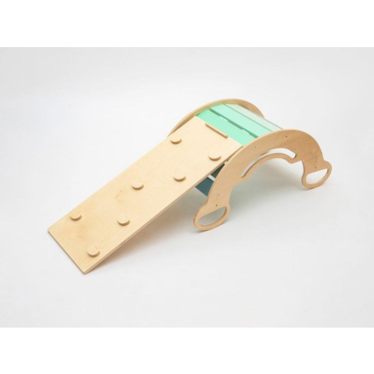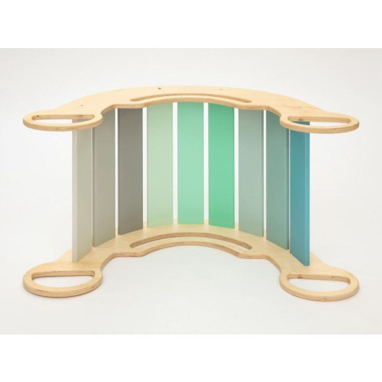 Detská drevená Montessori hojdačka smile 6in1, v príjemných pastelových farbách v modro-zelených tónoch v kombinácii s neutrálom šedou, vás prekvapí svojim dizajnom aj multifunkčnosťou. Hojdačka bude každý deň svojim širokým úsmevom lákať deti k príjemnému pohupovaniu aj k zábavnej hre. Jej využitie je všestranné, môže byť hojdačkou, skluzavkou, lezeckou dráhou, úkrytom i sedačkou, pri doplnení obojstrannou doskou aj detským nábytkom. Obojstranná doska nie je súčasťou hojdačky. Vyrobená je z tých najkvalitnejších materiálov, ručne hladko opracovaná a lakovaná farbami s atestom. Montessori hojdačka smile je širšia ako naše Montessori hojdačky 5in1, preto k tejto hojdačke ponúkame aj špeciálnu obojstrannú dosku, ktorá je doplnkom k hojdačkám smile. Vďaka doske ľahko premeníte hojdačku smile na detský stolček. Obojstranná doska nie je súčasťou hojdačky, pre využitie hojdačky ako nábytku je nevyhnutné dosku samostatne zakúpiť.