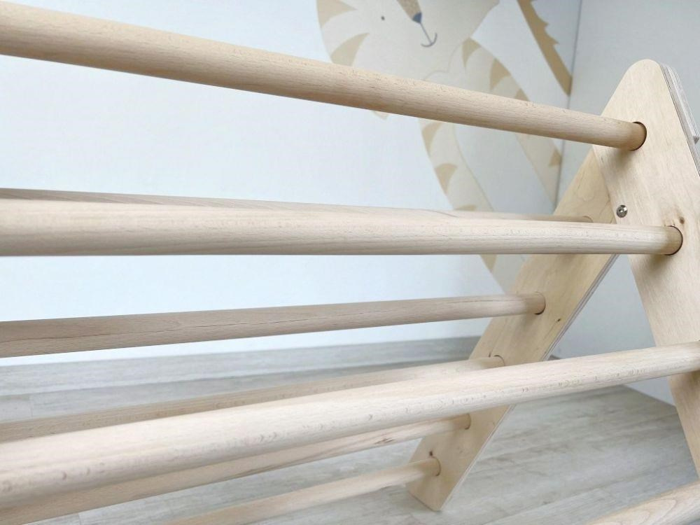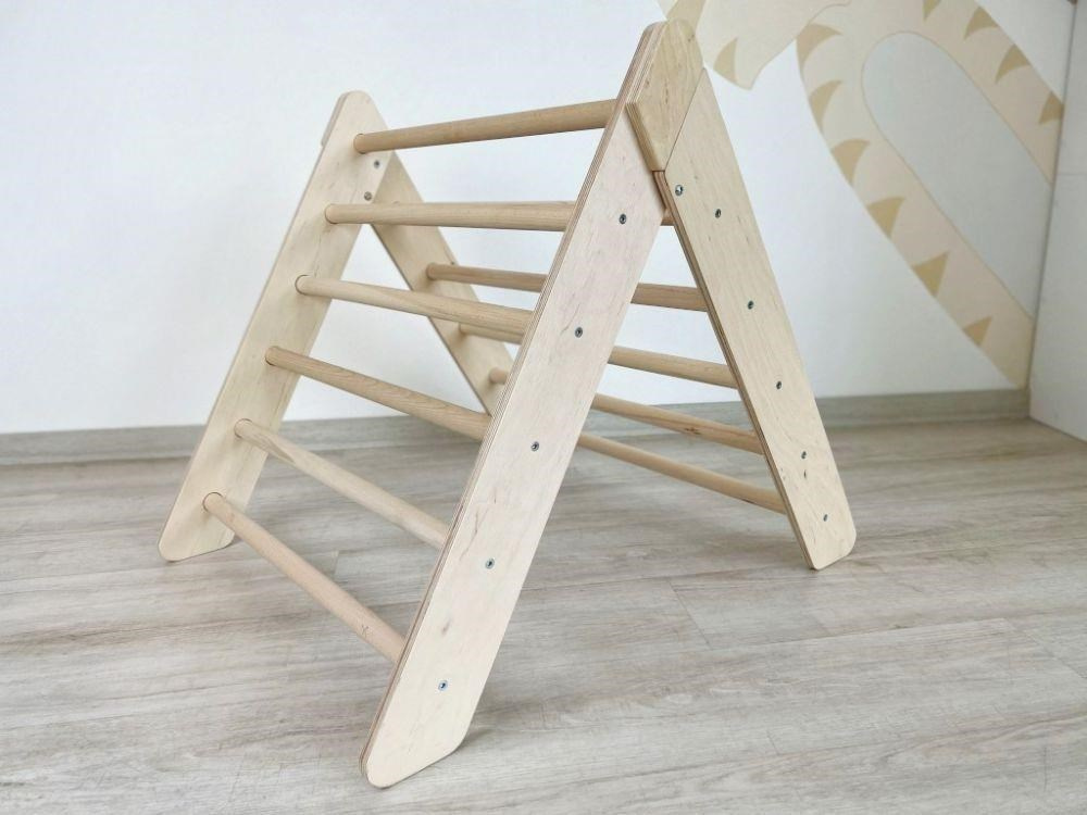 Montessori Piklerov trojuholník ponúka deťom možnosť pohybovej realizácie podľa vlastných schopností a odvahy. Deti sa úplne prirodzene naučia rozoznať a rešpektovať svoje možnosti a mieru odváhy, zároveň ich obratnosť bude stále rásť. Schodík má bezpečnú výšku, príslušenstvo je akurát široké pre pohodlné držanie a navyše je vybavené systémom proti otáčaniu príčníkov.