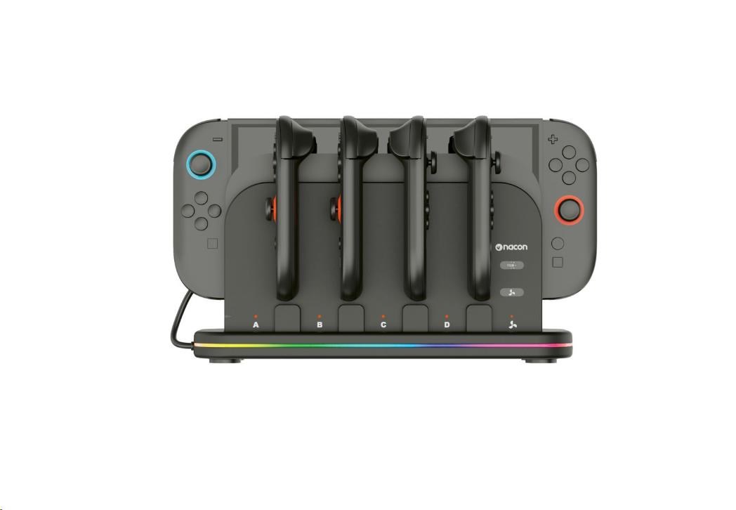 Táto nabíjacia dokovacia stanica od spoločnosti Nacon príde vhod všetkým majiteľom novej hernej konzoly Nintendo Switch 2 aj pôvodnej hernej konzoly Nintendo Switch, ktorí často potrebujú nabíjať väčší počet ovládačov Joy-Con. Stanica umožňuje nabíjať súčasne až štyri ovládače, ako aj samotnú konzolu, ktorej zabraňuje prehriatiu zabudovaný chladicí vetrák. O stave nabíjania každého z ovládačov informuje príslušný LED ukazovateľ, zatiaľ čo RGB pásik s výberom z deviatich rôznych efektov dodáva stanici štýlový, moderný vzhľad. Pretože napájací USB-C kábel nie je súčasťou balenia, slúži na pripojenie stanice do elektrickej siete originálne napájacie príslušenstvo dodávané s konzolou.