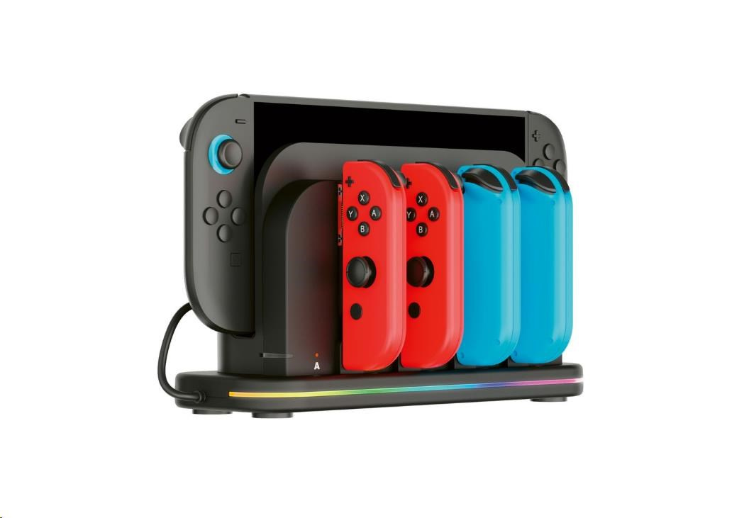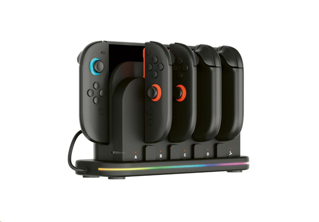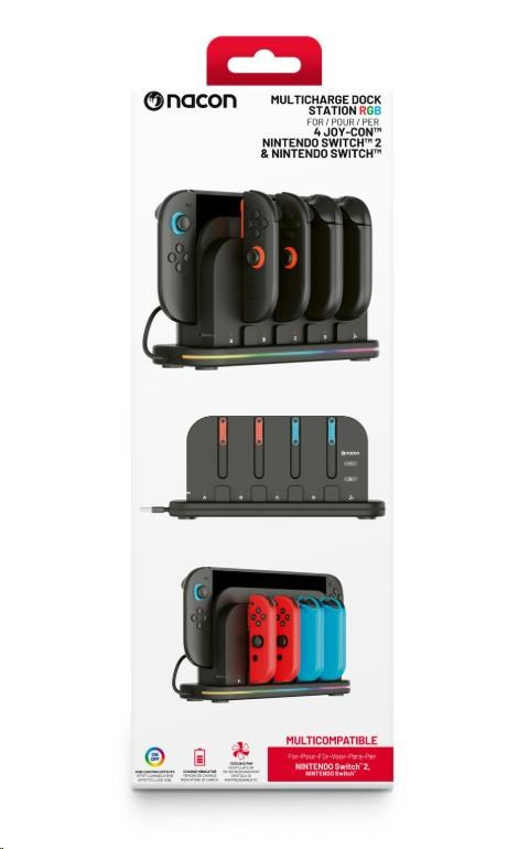 Tato nabíjacía dokovacia stanica od spoločnosti Nacon príde vhod všetkým majiteľom novej hernej konzoly Nintendo Switch 2 aj pôvodnej hernej konzoly Nintendo Switch, ktorí často potrebujú nabíjať väčší počet ovládačov Joy-Con. Stanica umožňuje nabíjať súčasne až štyri ovládače, ako aj samotnú konzolu, jejmuž prehriatiu zabraňuje zabudovaný chladený ventilátor. O stave nabíjania každého z ovládačov informuje príslušný LED ukazovateľ, zatiaľ čo RGB pruh s výberom z deviatich rôznych efektov dodáva stanici štýlový, moderný vzhľad. Pretože napájací USB-C kábel nie je súčasťou balenia, slúži na pripojenie stanice do elektrickej siete originálne napájacie príslušenstvo dodávané s konzolou.