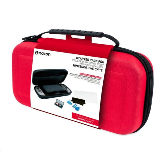 Táto súprava príslušenstva od spoločnosti Nacon určená pre hernú konzolu Nintendo Switch 2 obsahuje pevný prepravný obal, tvrdené ochranné sklo a praktické puzdro na uloženie ďalších herných kariet.