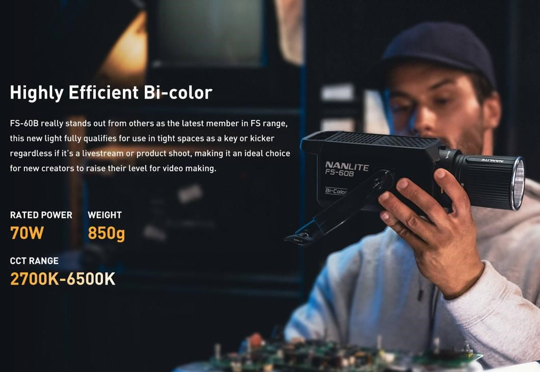 Model FS-60B je štúdiové svetlo pre začiatočníkov, ktorí chcú niečo dosiahnuť ako vo fotografovaní, tak pri natáčaní videí – je to kompaktné dvoubarevné LED svetlo, ktoré za dané peniaze ponúka vysokú hodnotu.