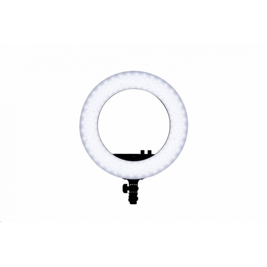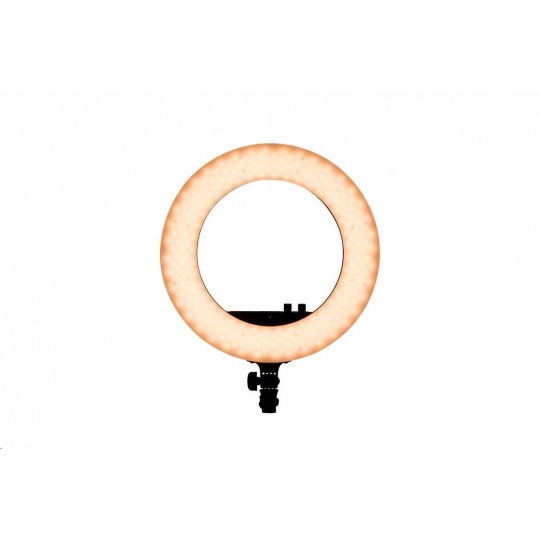 Stmievateľné dvojfarebné LED kruhové svetlo Nanlite Halo 18 s napájaním cez sieťový adaptér. Súčasťou balenia je aj držiak na telefón a obojstranné zrkadlo na make-up.