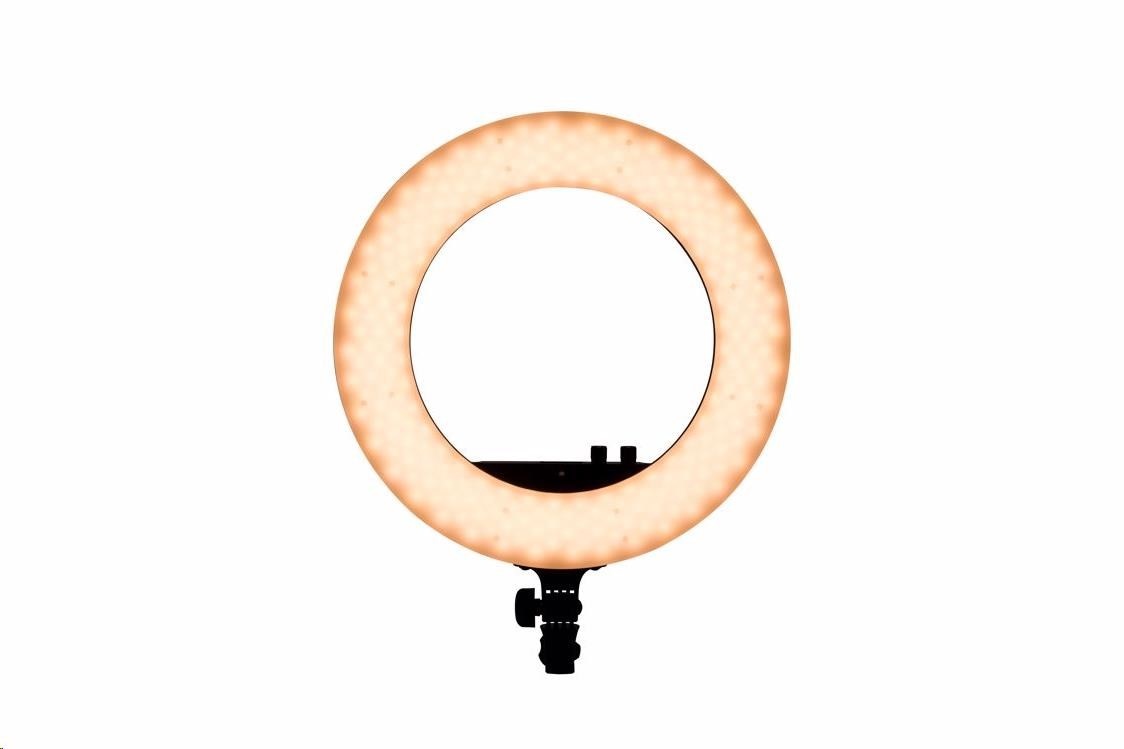 Stmievateľné dvojfarebné LED kruhové svetlo Nanlite Halo 18 s napájaním cez sieťový adaptér. Súčasťou balenia je aj držiak na telefón a obojstranné zrkadlo na make-up.