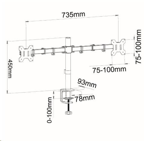 Nejlevnější dvoumonitorový držák ErgoSolid FN40 Levný, přesto vynikající kvality, držák na 2 monitory do kanceláří, školních učeben, firem a podniků - plně nastavitelný, záruka 5 let I vynikající držák může být levný - nabízíme Vám za bezkonkurenční cenu stolní dvoumonitorový držák pro monitory 13-29" s nastavením vdzálenosti, výšky, náklonu, otáčením do stran a funkcí pivot (otočení monitoru na šířku nebo na výšku). Držák má velmi pevnou spolehlivou konstrukci z ocely. Dodáván je v černém provedení a v balení naleznete krom instalačního materiálu i 2 typy úchytů na stolovou desku (na okraj stolu pomocí svěráku a do prostoru stolu pomocí šroubovice - nutné vyvrtání 1 otvoru o průměru 8mm). Na držák poskytujeme záruku 5 let. Ergosolid FN40 - precizní držák na 2 monitory za nejlepší cenu - nastavení 3D, záruka 5 let - držák do kanceláře, do školy, učebny, firmy nebo podniku Za kvalitu držáku plně ručíme, nebudete-li spokojeni, můžete nám zboží vrátit během 30-ti dní od zakoupení. Tato záruka platí i v případě nákupu na IČO. Nejlevnější dvoumonitorový držák - zavěšení 2 monitorů, nastavení 3D, TOP kvalita za bezkonkurenční cenu - držáky Ergosolid FN40 Technické údaje: celková nosnost 20kg maximální hmotnost 1 monitoru 10kg podporuje VESA standardy 75x75 a 100x100 univerzální, vhodný pro zavěšení monitorů s úhlopříčkou 13 až 29 palců nezávislé nastavení každého monitoru otáčení do stran +/- 180° náklon +/- 45° fukce PIVOT - otočení monitoru na šířku nebo na výšku nastavení vzdálenosti monitoru od úchytu délka ramene 367mm 3 klouby pro nastavení pozice na každém rameni nastavitelná výška ramen max. 430mm uchycení na stolové desky o průměru 10mm až 100mm balení obsahuje 2 typy uchycení na stolové desky (svěrák + šroubovice) materiál ocel barevné provedení černé balení obsahuje instalační materiál instalační návod v CZ záruka 5 let Cenově nejvýhodnější dvoumonitorový držák s 3D nastavením polohy monitoru. Bezpečná a spolehlivá konstrukce, 2 typy uchycení na stolové desky o průměru 10-100mm. Držák podporuje VESA standardy pro uchycení monitoru: VESA 75x75 VESA 100x100.