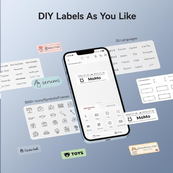 Pri navrhovaní štítku môžete použiť rôzne písma, tvary, ikony, veľkosti a formáty, aby ste si vytlačili etikety alebo štítky podľa svojej predstavy. Môžete importovať fotografie z telefónu alebo obrázky z internetu, aby bol dizajn jedinečný. Bezplatná aplikácia pre iOS alebo Android ponúka viac než 1500 ikoniek, viac než 100 rámečkov, 19 fontov písma a umožňuje tiež tlač QR kódov. Môžete si vybrať z rôznych štýlov písma, veľkostí a formátov, aby ste si vytlačili etikety alebo štítky presne podľa svojej predstavy. Tlačiareň automaticky rozpozná vložené štítky a aplikácia prispôsobí rozmer pre tlač.
