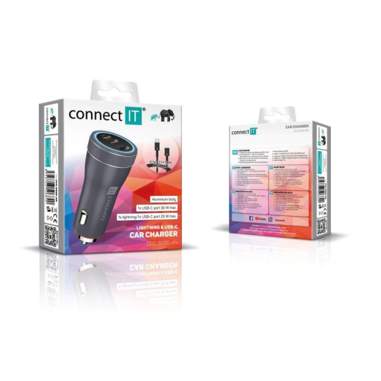 Unikátna trojpólová nabíjačka do auta CONNECT IT "Duplex" s kombináciou výstupov USB-C a Lightning s kombinovaným výkonom 55 W.
