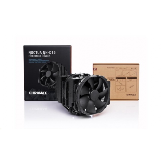 NH-D15 chromax.black je čierna verzia oceneného modelu NH-D15, špičkového tichého chladiča procesora spoločnosti Noctua. Vďaka rovnakej osvedčenej konštrukcii chladiča dual-tower a ventilátorom NF-A15 PWM zostáva verný úspešnému NH-D15, ktorý sa vyrovná výkonu vodných chladičov typu all-in-one pri zachovaní vynikajúceho tichého chodu. Verzia chromax.black s čiernymi ventilátormi a chladičom s čiernym povrchom zároveň kombinuje tieto prednosti s elegantným stealth vzhľadom. NH-D15 chromax.black, doplnený o slávny systém montáže SecuFirm2 do viacerých socketov, tepelnú pastu Noctua NT-H1 pre nadšencov a plnú 6-ročnú záruku výrobcu, je luxusnou voľbou pre overclockeerov aj tichých nadšencov, ktorí hľadajú chladič špičkovej triedy, ktorý vyzerá rovnako skvele ako chladí.