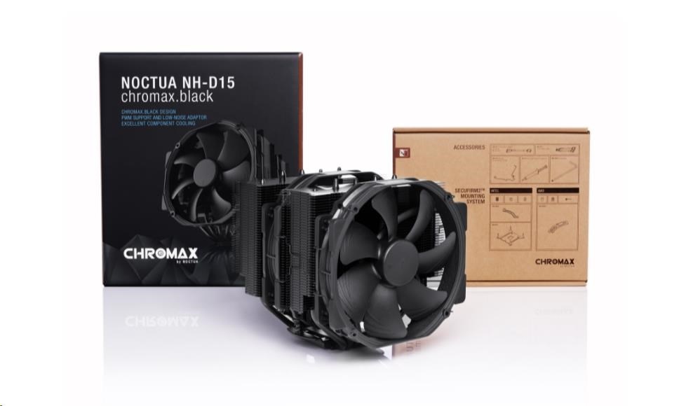 NH-D15 chromax.black je čierna verzia oceneného modelu NH-D15, špičkového tichého chladiča procesora spoločnosti Noctua. Vďaka rovnakej osvedčenej konštrukcii chladiča dual-tower a ventilátorom NF-A15 PWM zostáva verný úspešnému NH-D15, ktorý sa vyrovná výkonu vodných chladičov typu all-in-one pri zachovaní vynikajúceho tichého chodu. Verzia chromax.black s čiernymi ventilátormi a chladičom s čiernym povrchom zároveň kombinuje tieto prednosti s elegantným stealth vzhľadom. NH-D15 chromax.black, doplnený o slávny systém montáže SecuFirm2 do viacerých socketov, tepelnú pastu Noctua NT-H1 pre nadšencov a plnú 6-ročnú záruku výrobcu, je luxusnou voľbou pre overclockeerov aj tichých nadšencov, ktorí hľadajú chladič špičkovej triedy, ktorý vyzerá rovnako skvele ako chladí.