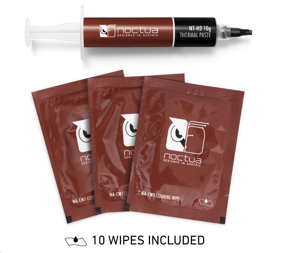 NT-H2 je ďalšia vylepšená druhá generácia oceneného hybridného tepelného vedenia Noctua. Kombináciou osvedčených vlastností ikonickej pasty NT-H1, vynikajúcej ľahkosti aplikácie a proslulej dlhodobej stability s novým, jemne vyladeným zložením mikročastíc pre ešte lepší tepelný výkon je NT-H2 pastou pre nadšencov s najvyššími nárokmi. Či už ide o vzduchové alebo vodné chladenie, aplikácie pre CPU alebo GPU, pretaktovanie alebo tiché systémy: NT-H2 bude dôsledne poskytovať výborné výsledky a vďaka priloženým čistiacim utierkam sa rovnako ľahko odstraňuje, ako nanáša.