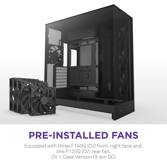 - Predinštalované ventilátory: Obsahuje tri ventilátory F140Q (CV) v pravej prednej časti a jeden ventilátor F120Q (CV) v zadnej časti. CV = verzia pre skrinku (3-pin DC)