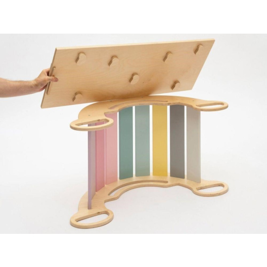Kvalitný drevený obojstranný kúsok (len k hojdačke SMILE) má všestranné využitie. Z jednej strany zábavná šmykľavka, po ktorej sa deti zosunú možno na mäkký podložku, na druhej strane lezecká doska s úchytmi, ktorá rozvíja pohybové zručnosti vašej dievčatka aj chlapca. Obojstranná doska je doplnkom k Montessori hojdačke SMILE. Položená na bočnej hrane hojdačky smile vytvorí deťom praktický stolček na desiatu aj na maľovanie. Obojstranné prkno nie je možné používať s Montessori hojdačkami 5in1 ELIS DESIGN. Prkno je širšie ako naše dúhové a drevené hojdačky. PRKNO JE DOPLNKOM IBA KU MONTESSORI HOJDAČKÁM SMILE, ktorú premení na detský stolček.