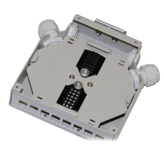 Box z optických vlákien na DIN lištu 8x SC simplex (8x LC duplex) so 16 spojovacími hrebeňmi