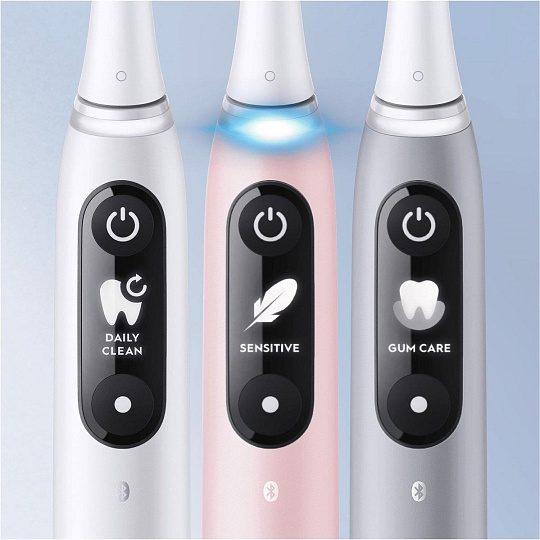 Oral-B iO pomáha chrániť ďasná pred prílišným tlakom. Inteligentná kontrola tlaku varuje červeným svetlom, ak vyvíjate príliš veľký tlak, a rozsvieti sa zeleno, ak používate optimálny tlak. Interaktívny displej umožňuje jednoduchú orientáciu v rôznych funkciách a nastaveniach kefky. Môžete si vybrať medzi rôznymi režimami čistenia, v reálnom čase dostanete personalizované pokyny a upozornenia na výmenu hlavice kefky. Vizuálny časovač poskytuje informácie o odporúčanej dobe čistenia 2 minúty. Zubná kefka vás ráno privíta a po vyčistení zubov vám vykúzli úsmev na tvári pre vynikajúce výsledky. Zažite zážitok z čistenia zubov, ktorý vás inšpiruje!
