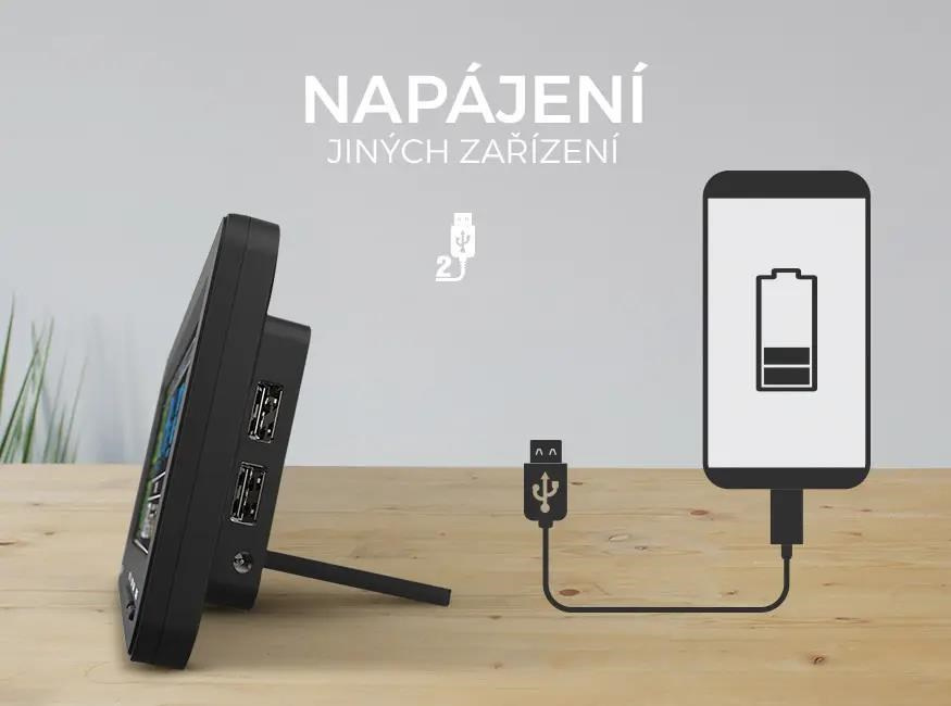 Na bočnej strane meteostanice sa nachádzajú dve výstupné USB konektory, ktoré môžete použiť na napájanie ďalších zariadení — napríklad na nabíjanie smartfónu alebo napájanie USB nočnej lampy.