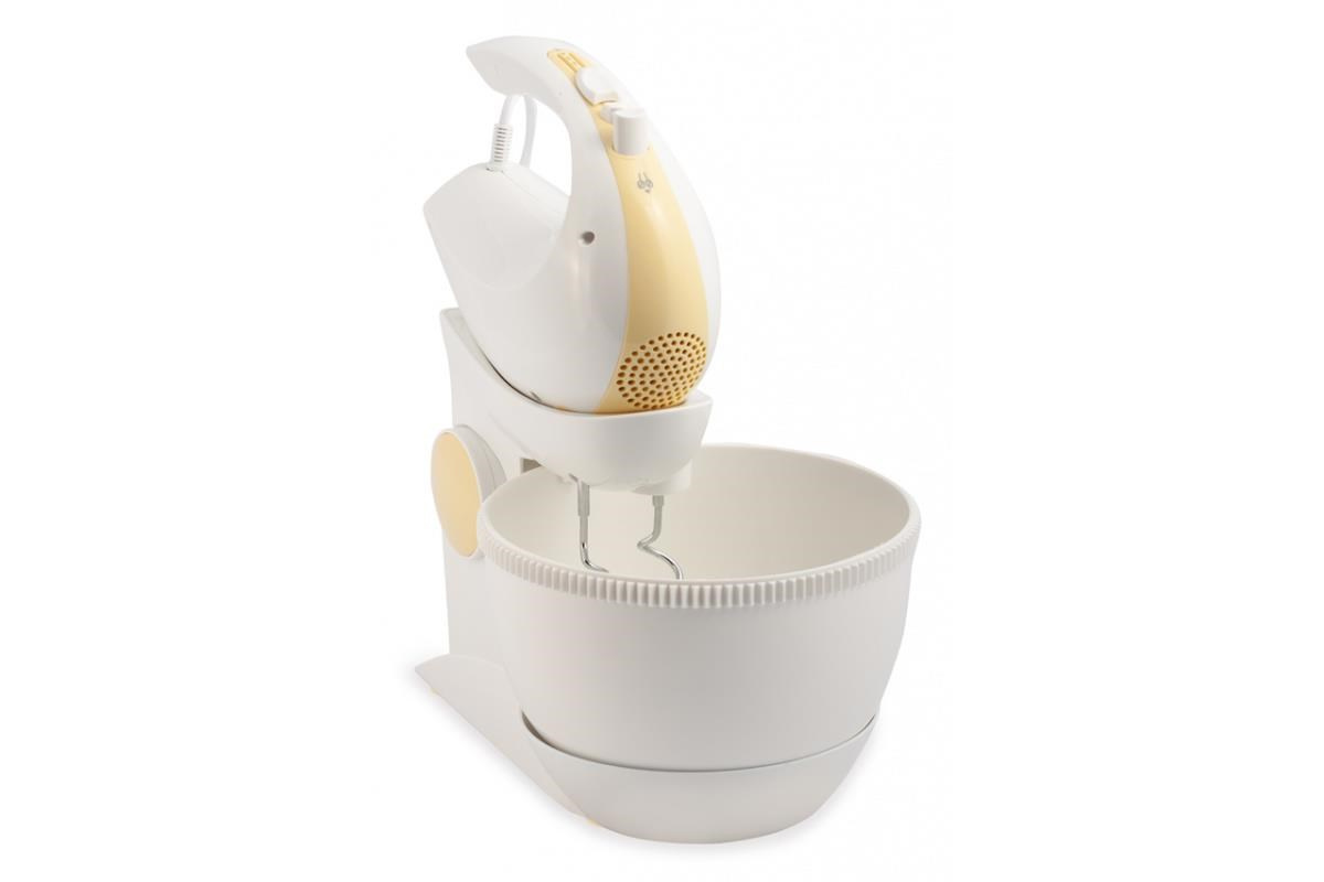 Elektrický ručný šľahač s otočnou nádobou, 5 rýchlostí a funkciou TURBO pre maximálny výkon, 2,5 l otočná nádoba s mechanickým pohonom, Sada šľahacích metiel a metiel na hnetenie, Výklopné rameno, Napájanie: 230V~ 50Hz, 300 W