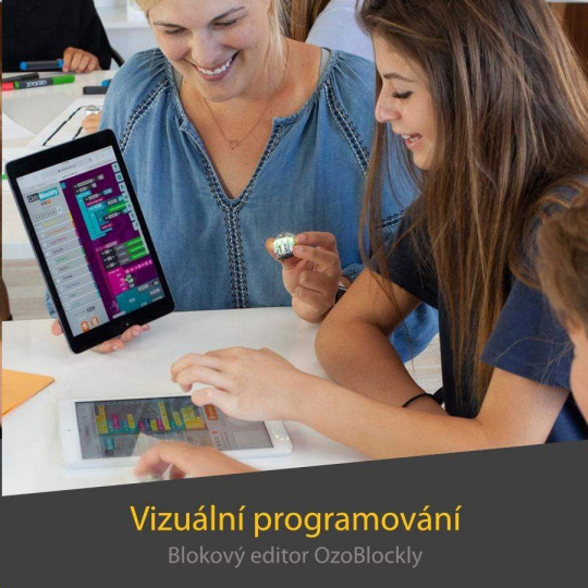 OzoBlockly otvoríte v ľubovoľnom webovom prehliadači na tablete alebo počítači bez ohľadu na platformu. V niekoľkých úrovniach náročnosti je možné programovať od pohybu cez svetelné efekty až po zložitejšie podmienené úkony. Hotový kód sa do Ozobota prenesie cez interaktívne miesto na obrazovke rýchlym problikávaním farebných sekvencií do senzorov na spodnej strane. Vytvorenú sekvenciu následne spustíte dvojitým stlačením vypínacieho tlačidla Ozobota.