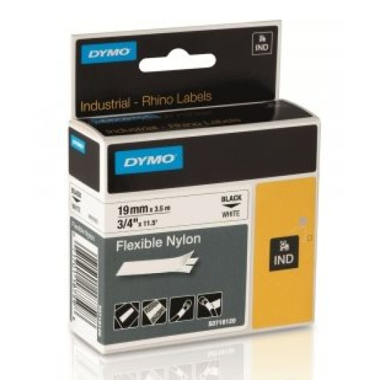 Popisovacia páska určená pre produkty DYMO 19mm Špeciálna profi D1 páska - RHINO - flexibilná nylonová páska D1 19 mm x 3,5 m, biela čierne písmo, biela refelxná páska SPECIÁLNÍ PÁSKY D1 - RHINO DO PRŮMYSLOVÝCH ŠTÍTKOVAČŮ RHINO 5000, RHINO 5