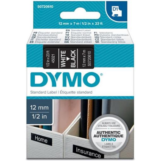 Popisovacia páska určená pre produkty DYMO 12mm biele písmo, čierna páska PÁSKY D1 DO ŠTÍTKOVAČOV DYMO rady LP, LM, RHINO 5000, RHINO 5200, RHINO 6000, ILP219, LW 400 Duo a LW 450 Duo