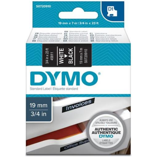 Popisovacia páska určená pre produkty DYMO 19mm biele písmo, čierna páska PÁSKY D1 DO ŠTÍTKOVAČOV DYMO rady LP, LM, RHINO 5000, RHINO 5200, RHINO 6000, ILP219, LW 400 Duo a LW 450 Duo