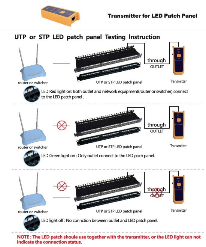 S patch panelom získate vysielač, ktorý pripojíte do zásuvky napr. v kancelárii a v serverovni ľahko identifikujete polohu trasy na patch paneli na tomto patch paneli. Na patch paneli sa rozsvieti zelená LED.Ďalšou možnosťou je identifikovať voľné trasy (nie je pripojené žiadne zariadenie). V serverovni pripojíte vysielač signálu k patch panelu a ak je na konci trasy aktívny prvok, na patch paneli sa rozsvieti červená LED.
