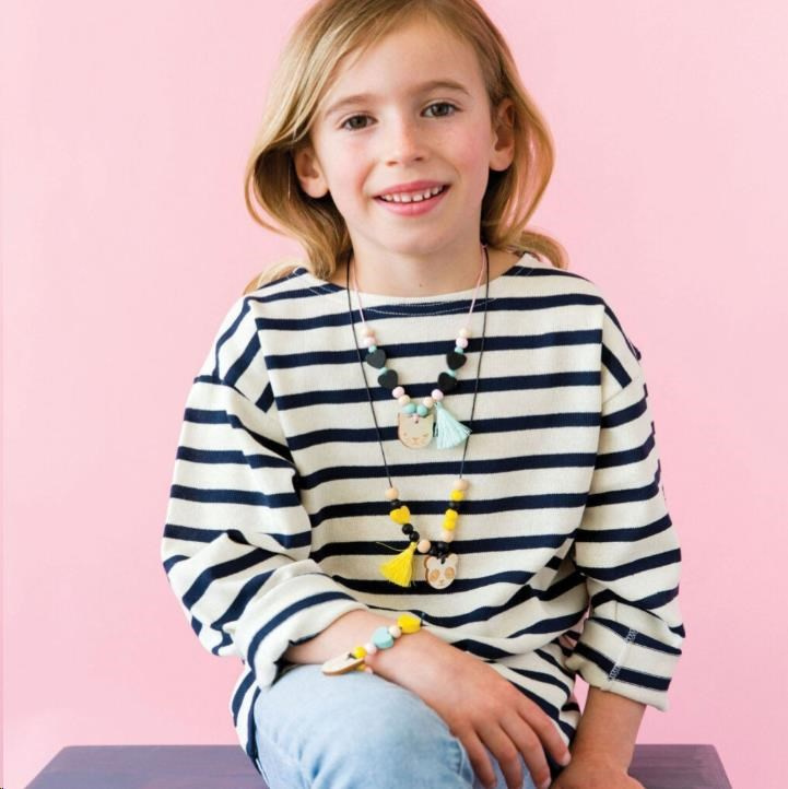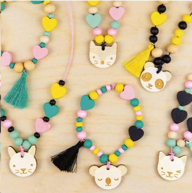 Súprava na výrobu šperkov podľa vlastnej fantázie obsahuje veľké množstvo drevených korálikov, ozdôb a príveskov, ale aj šnurowky a bezpečnú navlékaciu ihlu. Sada je spolu s návodom na použitie balená v praktickej plechovej kufríku s uškom.