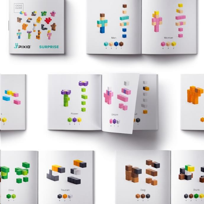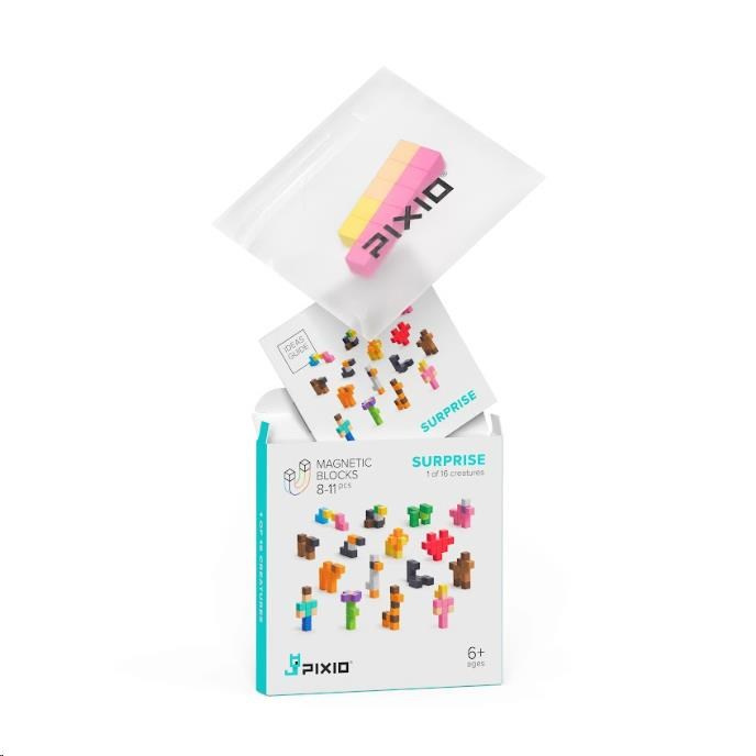 PIXIO 60101 - Surprise (Prekvapenie) je úvod do sveta Pixio. V každom balení nájdete jeden zo 16 kompaktných modelov pozostávajúcich z 8-11 kociek. Sú veľmi jednoduché, s jednoduchým procesom zostavovania, takže budú zábavné aj pre Pixio nováčikov. Kocky všetkých 16 modelov spolu tvoria materiál na stavbu väčších a farebnejších výtvorov. Návod na zostavenie bonusových modelov nájdete v aplikácii Pixio. Pixio je splnený sen fanúšikov Pixel Artu, hráčov Minecraftu a všetkých, ktorí sa radi hrajú. Použite ho ako učebný zdroj na rozvoj kreativity detí. Obsahuje náhodný mix 8-11 kociek, z ktorých si môžete zostaviť jeden zo 16 modelov série Surprise, alebo čokoľvek iné podľa vlastnej fantázie.