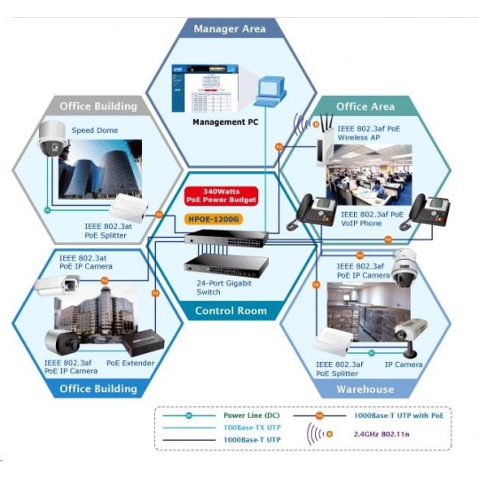 PoE (napájanie cez ethernet) Injektor HUB na napájanie zariadení cez ethernet podľa IEEE 802.3af a IEEE 802.3at. Je určený na napájanie zariadení, ako sú IP kamery PTZ alebo Speedome, prístupové body WiFi alebo telefóny VoIP. K dispozícii je celkovo 12 portov s celkovým výstupným výkonom 340 W, injektor je priechodný, napájací zdroj sa pripája k existujúcej ethernetovej linke Cat5/5e/6. Ak koncové zariadenie nepodporuje IEEE802.3at budete potrebovať POE-161S na zabezpečenie napájania vzdialeného zariadenia pre túto káblovú trasu. Vlastnosti: - 12 portov/injektorov 802.3at, in-line mid-span, (12 portov RJ-45 data-in, 12 portov data+power out) - IEEE 802.3, 802.3u, 802.3ab 1000Base-T - IEEE 802.3af, IEEE 802.3at, 52 V DC PoE (napájanie cez ethernet) - každý port plne napájaný - maximálna celková spotreba pripojených zariadení PoE 340 W - automatická detekcia napájania na každom porte - ochrana portov proti skratu a vzájomnému rušeniu - WEB správa zariadení - napájanie zariadení: 230 V AC, spotreba do 370 W - aktívne chladenie: 2 ventilátory - rozmery: 440 x 300 x 44 mm, 1U/19" - hmotnosť: 4,27 kg..