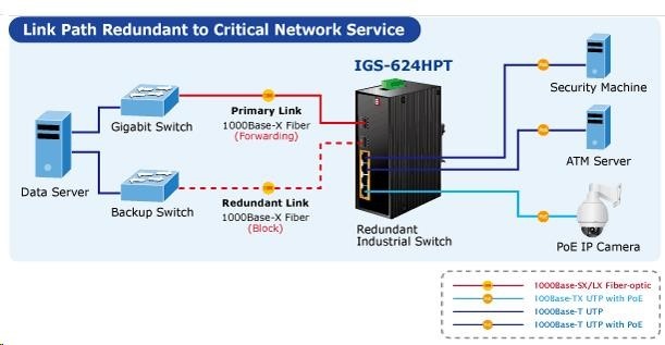 Planet IGS-624HPT, PoE switch 4x 1000Base-T, 2x SFP 100/1000Base-X, 802.3at 120W, DIN, IP30, -40 až +75st.C Priemyselné ethernetové prepínače sú určené do náročných prevádzkových podmienok so širokým rozsahom prevádzkových teplôt, neistým napájaním a častými otrasmi. Verzie série spínačov s rozšíreným teplotným rozsahom. Prepínače radu IGS sa ľahko inštalujú na štandardnú lištu DIN alebo priamo na stenu a umožňujú nasadenie známej technológie Ethernet aj v priemyselnom prostredí. Sú vhodné aj na inštaláciu vo vonkajších krytoch s veľkými výkyvmi prevádzkových teplôt (typicky bezdrôtové aplikácie a aplikácie MAN ISP). Ako prepínač PoE môže priamo napájať až 4 zariadenia IEEE 802.3at, a preto je ideálny pre aplikácie so zníženou dostupnosťou energie. Vlastnosti: - 4x 1000Base-T, prepínanie, plný duplex (1000/2000 Mb/s), automatické vyjednávanie (10/100/1000 Mb/s), automatická detekcia priameho/krosového kábla na každom porte - PoE IEEE 802.3at injektory so zaťažiteľnosťou 30 W/port, celkovo až 120 W - 2x SFP 100-FX / 1000Base-X na inštaláciu mini-GBIC modulov, zdieľané porty s 5 a 6 TP portmi - priepustnosť: zbernica 12 Gb/s, prevádzkovo 8.93Mp/s(64Bajtov) - 1k MAC adries, MTU max. 9216Bajtů - DIP přepínače pro nastavení práce portů, LED indikátory stavu provozu - instalace na DIN lištu, montážní díl součástí - instalace na zeď, montážní díl součástí - krytí IP30 - napájení: 48V DC redundantní, připojení možné ze dvou různých zdrojů (nejsou součástí balení); vlastní příkon do 15W - ochrana proti přepólování, připojení napájení na svorkovnici, umístění na spodním panelu (nepřekáží při montáži na zeď) - přepěťová ochrana napájení do 6kV proti napěťovým špičkám (EFT) - přepěťová ochrana LAN portů proti elektrostatickému náboji do 6kV (ESD) - zařízení je odolné proti pádu (IEC-60068-2-32) z výšky 75cm na všechny dopadové části - zařízení je odolné proti vibracím (IEC-60068-2-6) 10-500-10Hz, 4x g, 0,5oct/min - zařízení je odolné proti přetížení krátkodobému zrychlení 50g, dlouhodobému 4g, (IEC-60068-2-27) - EMI/EMS, elektromagnetická kompatibilita a slučitelnost dle CE EN-6100-4-2,3.