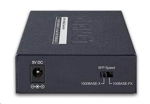 Prostredníctvom zabudovaného prepínača DIP na zadnom paneli možno model GT-1205A nakonfigurovať na podporu modulov SFP 100BASE-FX alebo 1000BASE-X. Pomocou modulov SFP série MFB/MGB od spoločnosti PLANET možno zariadenie GT-1205A opticky pripojiť na vzdialenosť až 2 km pomocou multimódového vlákna alebo až 120 km pomocou jednovidového vlákna alebo vlákna WDM.