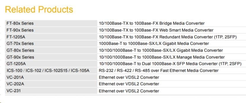 - PLANET Fast Ethernet, Gigabit Ethernet Media Converter série: FT-80x / FT-90x / FT-1205A a GT-70x / GT-80x / GT-90x / GT-1205A