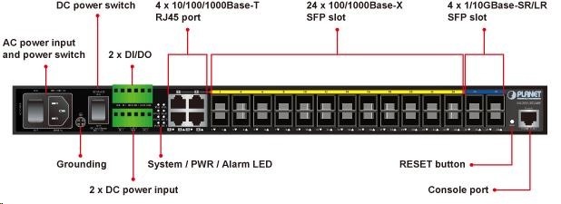 Planet MGSW-28240F Metro switch 24x SFP(DDM), 4x SFP+, 4x TP, AC+DC, DI/O, Web/SNMPv3, IGMPv3, IPv6
