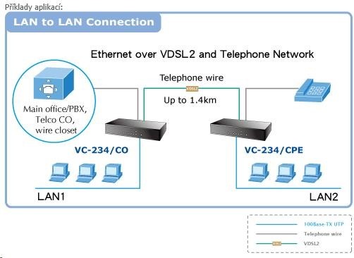 Planet VC-234, Eth. VDSL2 konvertor, 100Mbit, master/slave, 2x RJ-11, splitter, 4x RJ-45