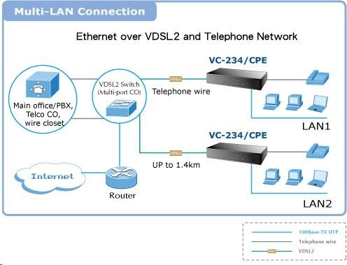 Ethernet cez telefónnu linku (technológia VDSL2). 4x LAN RJ-45, 2x RJ-11 konektor pre VDSL2 a POTS. 100/100 Mb/s na vzdialenosť 300 m.Priehľadný most. Dosah až 1,4 km. Nastavenie prepínača DIP. Voliteľný Master (CO) / Slave (CPE). Zabudovaný rozdeľovač. Výkonný konvertor LRE (Long Reach Ethernet) Ethernet na VDSL2 (Very-high-data-rate Digital Subscriber Line 2) umožňuje prenášať dáta cez symetrický pár vodičov rýchlosťou až 100 Mb/s na vzdialenosť 300 m alebo 20/4 Mb/s na vzdialenosť až 1,4 km. Integrovaný rozdeľovač zachováva hlasovú službu na telefónnej linke bez ďalších úprav zapojenia, dátová prevádzka sa jednoducho pridá k existujúcej hlasovej prevádzke. Je teda možné používať telefónne káblové vedenia pôvodne určené nielen na pripojenie k účastníkom, ale aj medzi analógovými ústredňami. ISP (poskytovateľ internetových služieb) tak môže ponúkať multimediálne služby, VOD (video na požiadanie), VoIP (hlas cez IP), videotelefón, IPTV atď. Zariadenie je univerzálne ako jednotka master (CO) / slave (CPE), režim sa nastavuje prepínačom. Jednotka podporuje prevádzkové režimy VDSL2 "17a" a "30a", ako aj "band Plan997", ktoré ovplyvňujú symetrický prenos dát pri vyšších rýchlostiach. Vlastnosti: - 2x RJ-11 port pre VDSL a POTS (Plain Old Telephone Service) - 4x LAN 10/100Base-TX, prepínanie, plný duplex (100/200 Mbps), automatické vyjednávanie (10/100 Mbps) - transparentný pre IEEE 802.1Q VLAN tag - parametre nastavené prepínačmi DIP na zariadení: výber CPE/CO, výber modulácie, výber komunikačného limitu, výber SNR - podpora štandardov: IEEE 802.3, 10Base-T, IEEE 802.3u, 100Base-TX, IEEE 802.3x - spĺňa štandardy VDSL ITU-T G.993.1, ITU-T G.997.1, ITU-T G.993.2 - Rozmery: 155 x 86 x 26 mm - Hmotnosť: 368 g - Externé napájanie 5V/2A - Prevádzková teplota: 0 až 50 °C Rozsah a rýchlosti na vedeniach s vodičmi AWG24 a lepšími: > profil 17a (Downstream / Upstream) - 200m -> 99/70Mbps - 400m -> 99/60Mbps - 600m -> 90/45Mbps - 800m -> 50/28Mbps - 1000m -> 40/12Mbps - 1200m -> 20/7Mbps - 1400m -> 20/4Mbps > profil 30a (Downstream / Upstream) - 300m -> 100/100Mbps - 400m -> 90/90Mbps - 600m -> 69/55Mbps - 800m -> 48/9Mbps..
