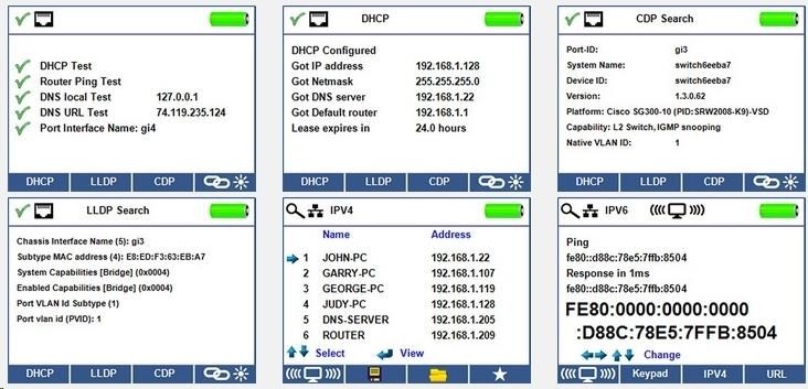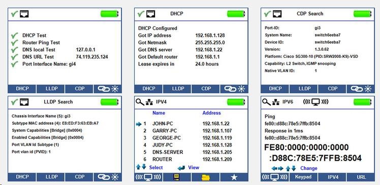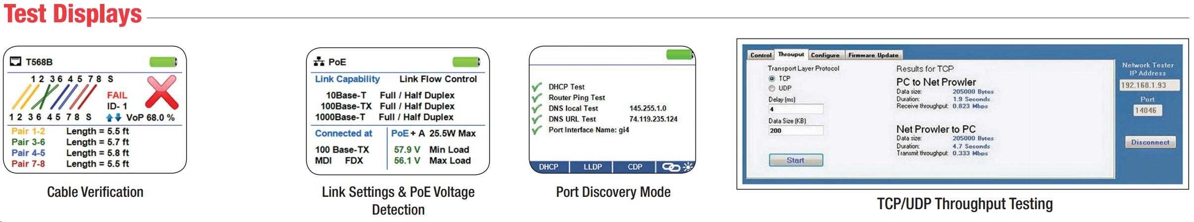 - Testuje ethernetovú kabeláž CAT3/5e/6/6a a overuje konektivitu pomocou testov prerušenia, skratov, nesprávneho zapojenia, rozdelenia a prepínania.
