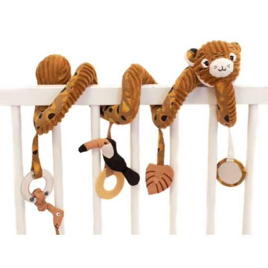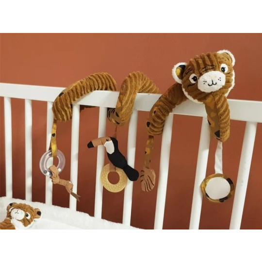 Originálna špirála na postieľku, na kočík alebo na hrazdičku, v podobe roztomilého tigra upúta pozornosť každého bábätka. Úžasne hebká špirála s chrastítkom, zrkadielkom, hryzátkom aj šuštiacim lístkom stimuluje detské zmysly, rozvíja jemnú motoriku a koordináciu očí a rúk. Prezrite si originálnu špirálu, ktorá vykúzli úsmev na tvári deťom aj rodičom.