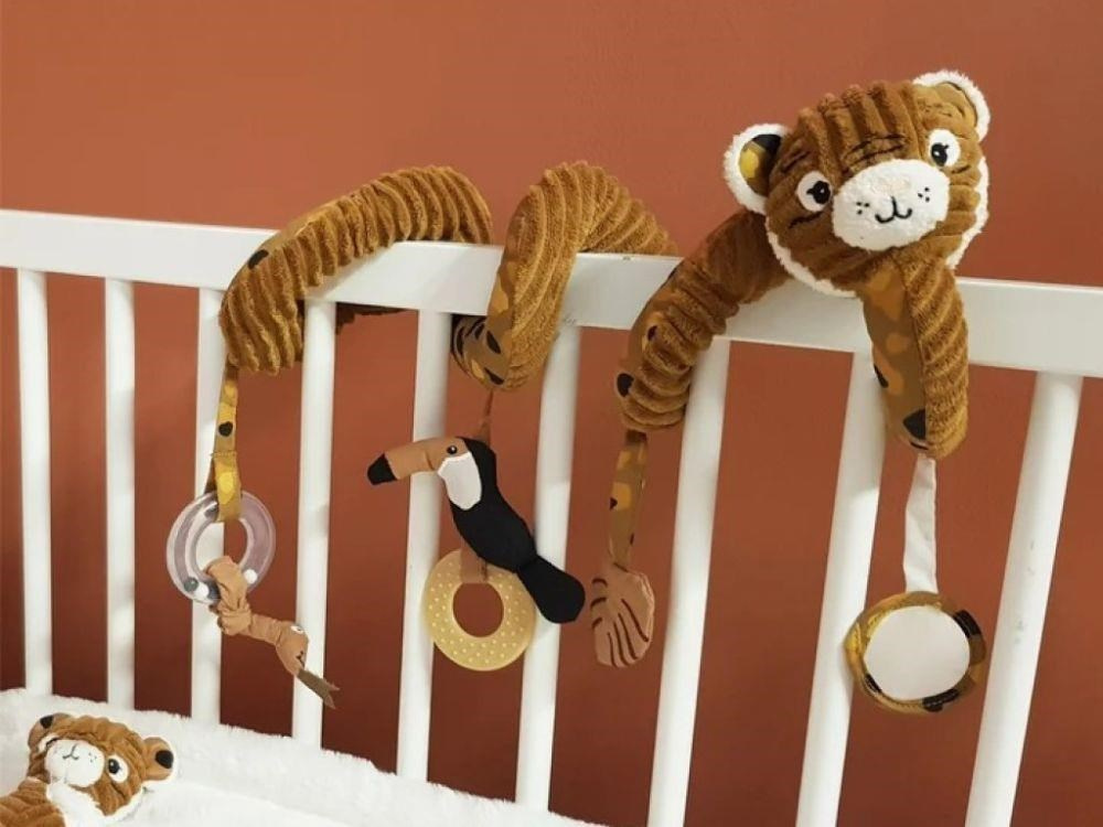 Originálna špirála na postieľku, na kočík alebo na hrazdičku, v podobe roztomilého tigra upúta pozornosť každého bábätka. Úžasne hebká špirála s chrastítkom, zrkadielkom, hryzátkom aj šuštiacim lístkom stimuluje detské zmysly, rozvíja jemnú motoriku a koordináciu očí a rúk. Prezrite si originálnu špirálu, ktorá vykúzli úsmev na tvári deťom aj rodičom.