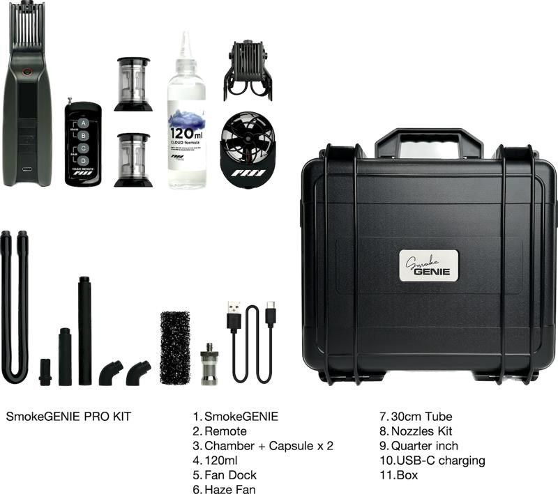 Okrem zariadenia SmokeGENIE obsahuje profesionálna sada bezdrôtový diaľkový ovládač, dve vymeniteľné dymové komory, adaptér pre filmový mľžny ventilátor, štyri presné trysky na tvarovanie dymu, trysku pre tekutý dym a 12" silikonovú predlžovaciu trubicu. Súčasťou balenia je kvapalina Cloud Formula, s ktorou môžete ihneď začať vytvárať dym. Súčasťou balenia sú tri li-ion batérie 18650 a 23A batérie na napájanie zariadenia SmokeGENIE a diaľkového ovládania. Vďaka priloženému ochrannému pevnosťou puzdru budete mať zariadenie SmokeGENIE a príslušenstvo pri cestovaní v bezpečí.