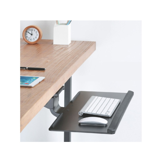 Polička na klávesnicu Fiber Mounts M7C95 Plne nastaviteľná doplnková polička na klávesnicu, rozmery 670x255mm Profesionálna plne nastaviteľná stolová doplnková polička na klávesnicu a myš, ktorá poskytuje skutočné ergonomické riešenie pre Vašu najpohodlnejšiu prácu. Nastavenie vo všetkých polohách s aretáciou. Ak požadujete to najlepšie a záleží Vám na zdravom pracovnom štýle, túto poličku si zamilujete. Profesionálna stolová polička na klávesnicu, plne nastaviteľná: vysúvacia, otočná, sklopná, výškové nastavenie 34cm, aretácia polohy - Fiber Mounts M7C95 Technické údaje: nosnosť 2kg výsuvná 470mm výškové polohovanie 340mm otáčanie +/- 180° rozsah naklápania +15 / -13° rozmery police 670 x 255 snadné schovanie poličky s klávesnicou pod stolovou doskou aretácia polohy najvyššia kvalita snadná inštalácia a ovládanie zvýšenie komfortu a pracovného výkonu farebné prevedenie čierne záruka 3 roky Precízne veľmi jednoduché nastavovanie poličky na klávesnicu Fiber Mounts M7C95 Ušetrite na svojom stole veľa miesta - dajte klávesnicu a myš na túto výsuvnú poličku a kedykoľvek ju môžete uschovať pod stolovou doskou. Polička je plne nastaviteľná a pri práci poskytuje vysoký komfort.