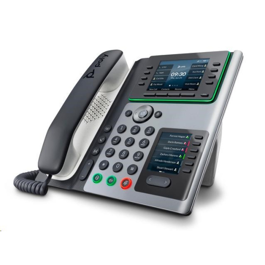 | Správa zabezpečenia | Podpora syntaxe URL s heslom; TLS (Transport Layer Security); Šifrovanie Wi-Fi: WEP, WPA-Personal, WPA2-Personal, WPA2-Enterprise s 802.1x (EAP-TLS, PEAP-MSCHAPv2); Šifrovanie médií SRTP pomocou 256-bitového šifrovania AES Poskytovanie prostriedkov Poly Zero Touch; Poly Lens; Cloudová správa služby správy zariadení Polycom pre poskytovateľov služieb (PDMS-SP); SDP Podpora znakov Unicode UTF-8; Nastaviteľný stojan na stôl (2 pozície); |