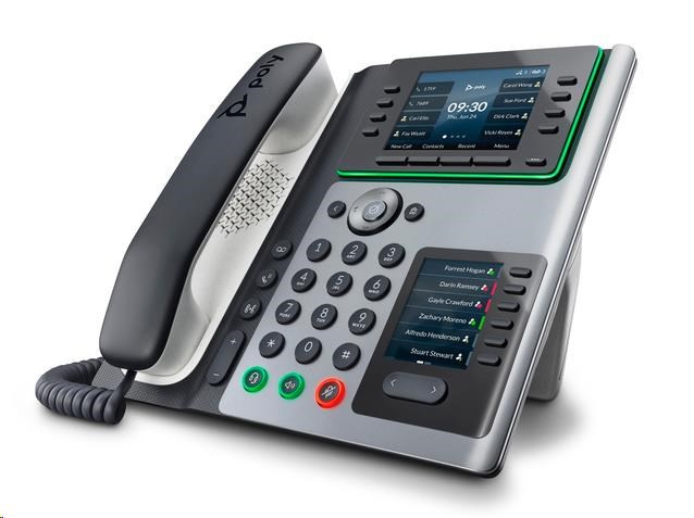 | Správa zabezpečenia | Podpora syntaxe URL s heslom; TLS (Transport Layer Security); Šifrovanie Wi-Fi: WEP, WPA-Personal, WPA2-Personal, WPA2-Enterprise s 802.1x (EAP-TLS, PEAP-MSCHAPv2); Šifrovanie médií SRTP pomocou 256-bitového šifrovania AES Poskytovanie prostriedkov Poly Zero Touch; Poly Lens; Cloudová správa služby správy zariadení Polycom pre poskytovateľov služieb (PDMS-SP); SDP Podpora znakov Unicode UTF-8; Nastaviteľný stojan na stôl (2 pozície); |