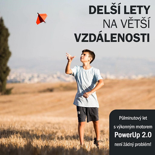 S modelom POWERUP 2.0 sa zaobídete bez pokročilých technických znalostí a funkčný model motorizovaného papierového lietadla zvládnu bez problémov zložiť aj menšie školopovinné deti. V balení nájdete predtlačené šablóny, avšak bez obáv môžete využiť aj svoje vlastné dizajny. Akonáhle máte lietadlo hotové, jednoducho naň pripevníte karbónovú os s motorom a priloženým nabíjacím boxom oživíte integrovaný superkondenzátor. Celá akcia nabitia zaberie rovných 20 sekúnd, po ktorých stačí lietadlo s roztočenou vrtuľou vypustiť do priestoru a užívať si pohľad na plynulý voľný let. POZOR: Nikdy nenabíjajte dlhšie ako 20 sekúnd. Na väčšinu letov vám bude stačiť 10 s nabíjania.