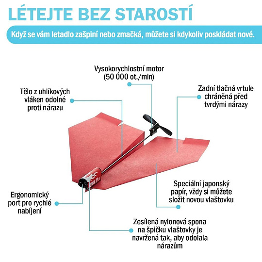 Skladanie papierových lietadiel baví každú generáciu. Sada PowerUp 2.0 RED vybaví obyčajné papierové lietadlá vlastným elektrickým pohonom, vďaka ktorému ostanú vo vzduchu dlhšie ako pol minúty a uletia desiatky metrov.