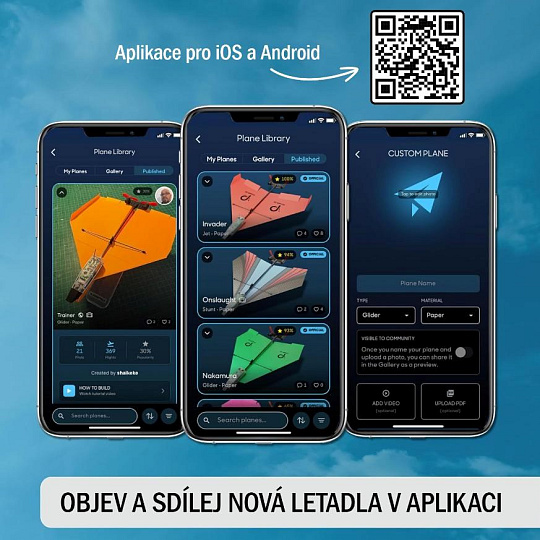Riadiaca aplikácia pre smartfóny funguje ako váš osobný letecký inštruktor aj palubná doska zároveň. Počas letu sledujete reálnu telemetriu vrátane stavu batérie, sily Bluetooth signálu a aktuálneho výkonu motorov. Na jemné doladenie letových vlastností môžete využiť aj pokročilé posuvníky priamo na displeji. Aplikácia ďalej obsahuje obsiahlu knižnicu podrobných videonávodov, tipy na vylepšenie aerodynamiky a plány na stavbu ďalších typov papierových modelov.