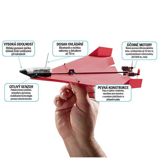 Zaobídete sa bez technických znalostí alebo zdĺhavého študovania manuálov. Základný model podľa priložených šablón zložíte rovnako ľahko a rýchlo, ako by ste skladali klasické papierové lietadlo. Následne stačí pripevniť modul s motorom a vyrovnávaciu tyč, všetko zaistiť lepiacou páskou (keby ste náhodou búrali), spárovať s telefónom a môžete štartovať. Rýchloupínací systém umožňuje experimentovať nielen s obyčajným papierom, ale aj s ľahkým kartónom, balzovým drevom alebo penovými materiálmi. Palubný počítač navyše sám dorovnáva drobné nepresnosti v skladaní, takže aj úplní začiatočníci zažijú hladký let hneď na prvý pokus.