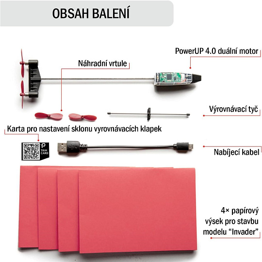 Základné balenie obsahuje inteligentný duálny motor PowerUp 4.0, nabíjací kábel, náhradné vrtule, krížovú vzperu, kartičku na vyladenie sklonu klapiek a sadu hárkov. Celý set tak funguje ako fantastický darček, pri ktorom malí aj veľkí piloti nájdu všetko potrebné na okamžitý štart. Pre maximálny zážitok z lietania odporúčame prikúpiť balenie šablón PowerUp Paper Templates Airframe (2.0/4.0). Okrem atraktívnych farebných potlačí je súčasťou aj špeciálny vodoodolný papier, vďaka ktorému môžete s pokojom pristávať vo vlhkej tráve.